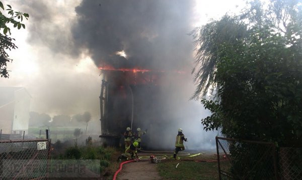 Als besonders aufwendig erwies sich die Versorgung mit Löschwasser. Es befindet sich zwar eine neue Wasserleitung in der Straße, allerdings sind die Hausanschlüsse noch nicht fertig, so dass noch kein Wasser vom Hydranten entnommen werden konnte, da dieser noch nicht in Betrieb ist. Die Kameradinnen und Kameraden musste so eine mehrere hundert Meter lange Schlauchstrecke bis zur Bode legen, um Löschwasser zu erhalten. Die Brandbekämpfung wurde dann mittels mehreren C-Rohren und über ein Wenderohr der Drehleiter vorgenommen.