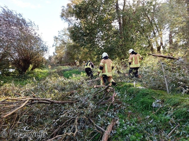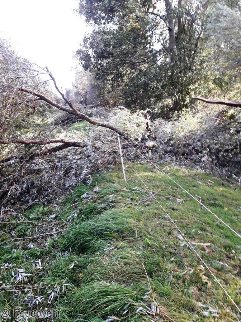 Sturmschaden / Baum auf Absperrung einer Rinderkoppel gestürzt. Tiere drohen zu fliehen.