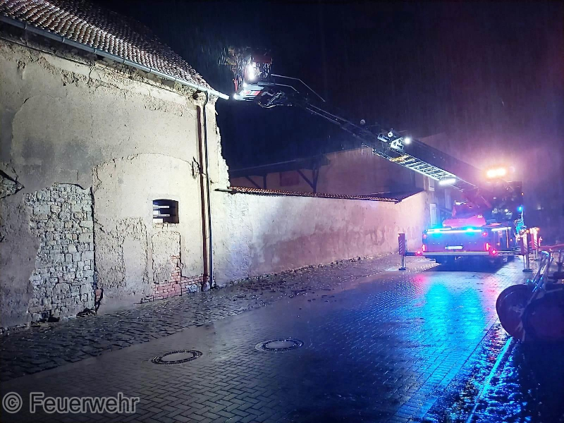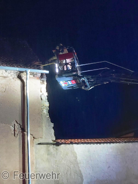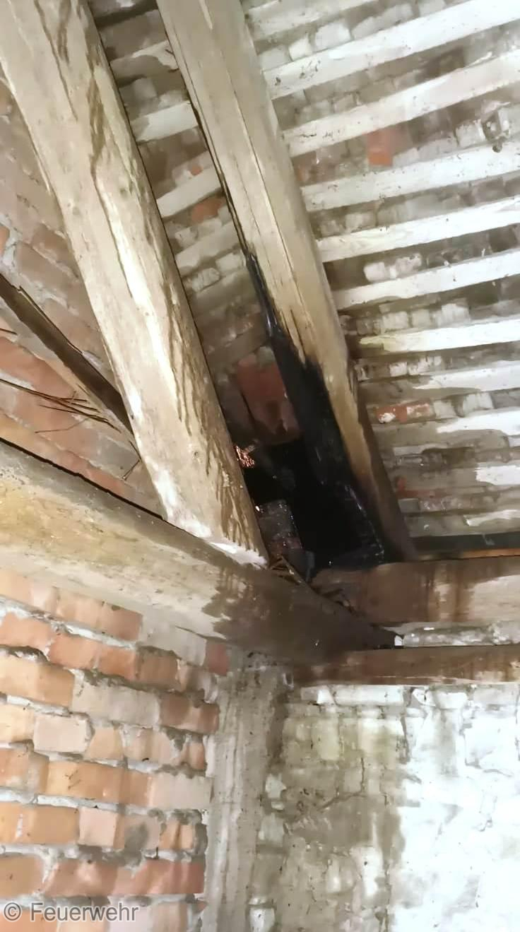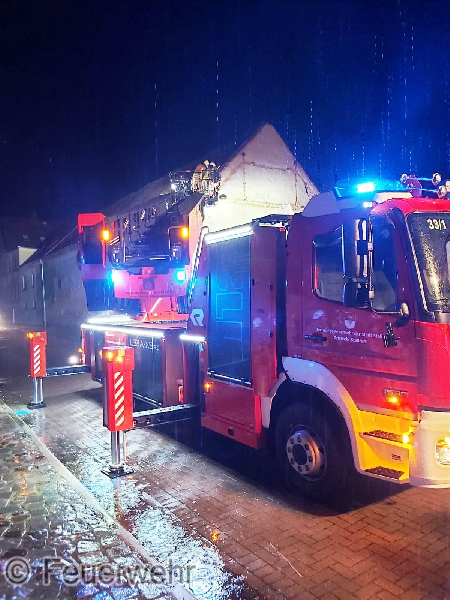 Es handelte sich wahrscheinlich um einen Blitzeinschlag im Gebäude, welcher dazu führte, dass sich ein Balken entzündete. Es wurde sofort mit der Brandbekämpfung begonnen. Ein weiterer Trupp übernahm die Kontrolle im Inneren und das Dach wurde über die nachgeforderte Drehleiter der Ortsfeuerwehr Staßfurt von Außen mittels Einreißhaken geöffnet und abgeprüft.