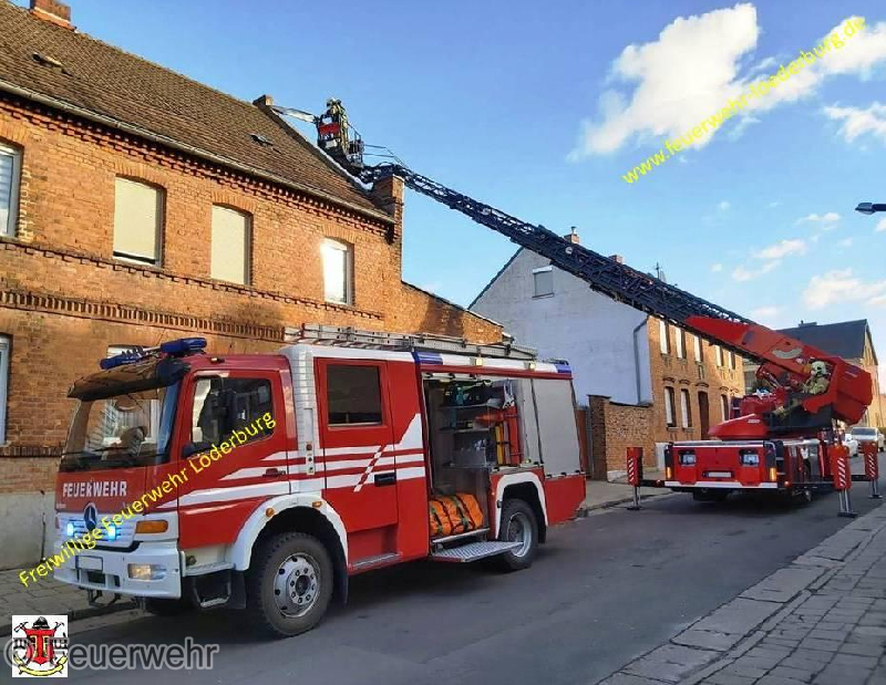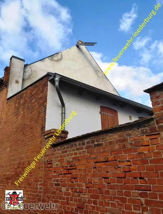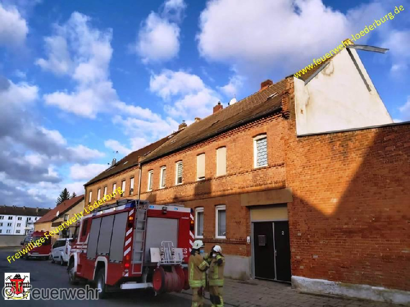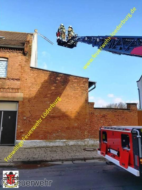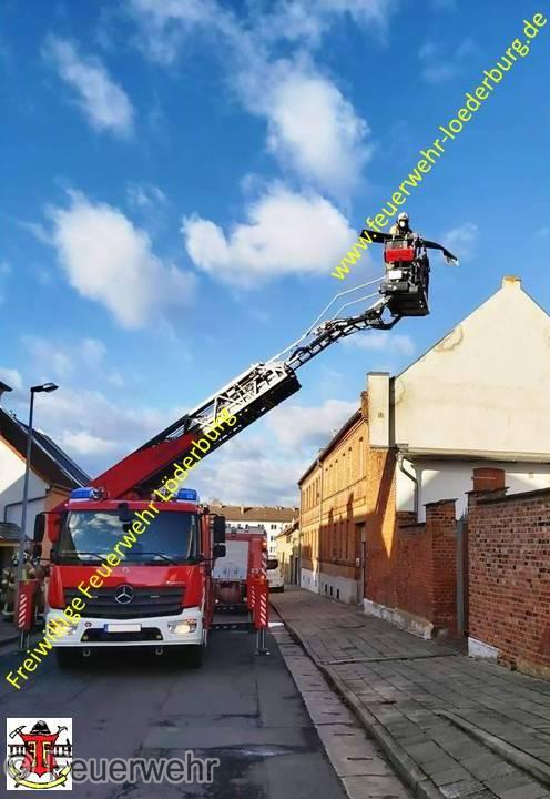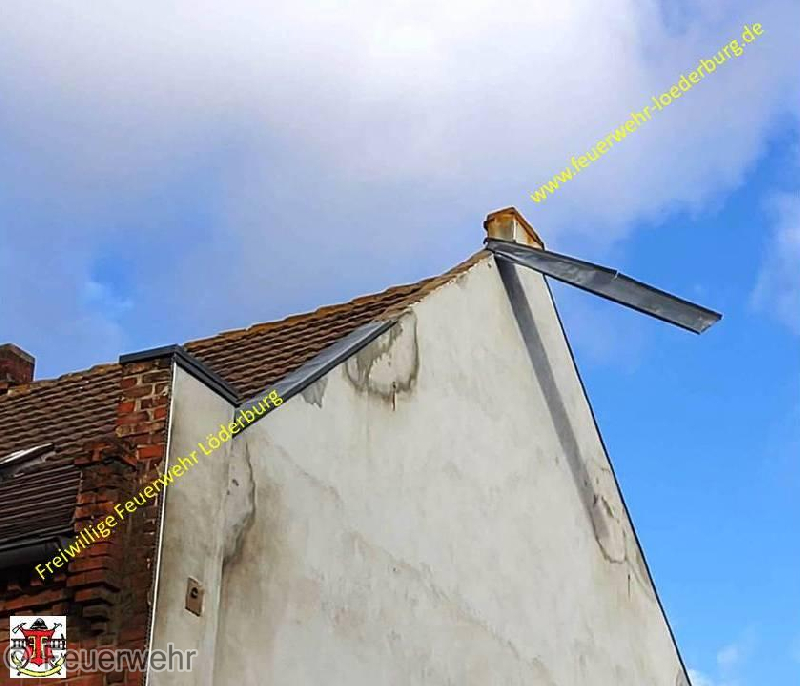 Es handelte sich um ein loses Blech an einem Hausdach, welches eine akute Gefährdung darstellte und entfernt werden musste. Da dies durch die bereits vor Ort befindlichen Kräfte und Mittel (auch im Sinne des Eigenschutzes) nicht realisiert werden konnte, wurde durch den Einsatzleiter die Drehleiter der Ortsfeuerwehr Staßfurt hinzugezogen.