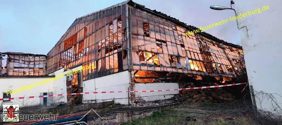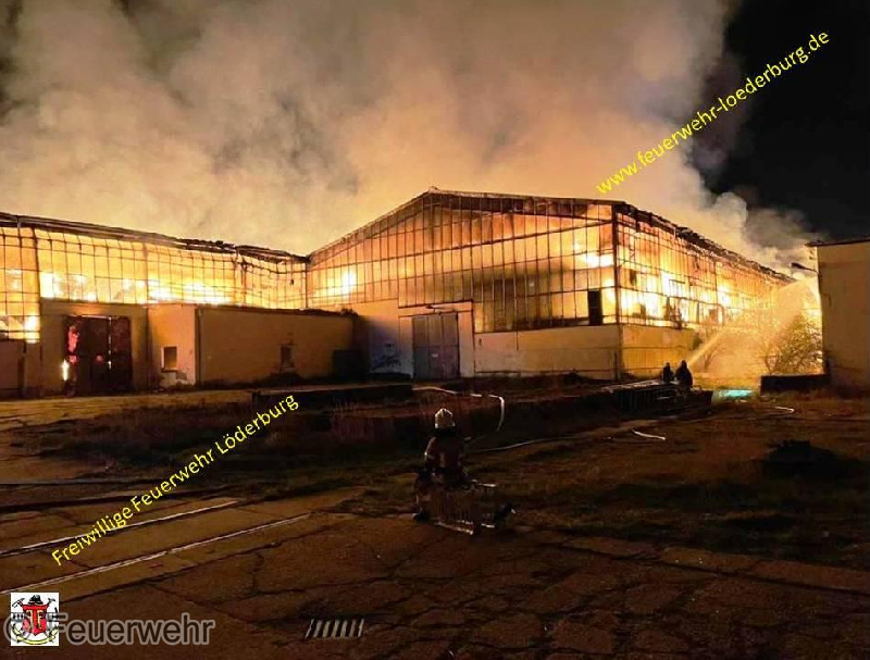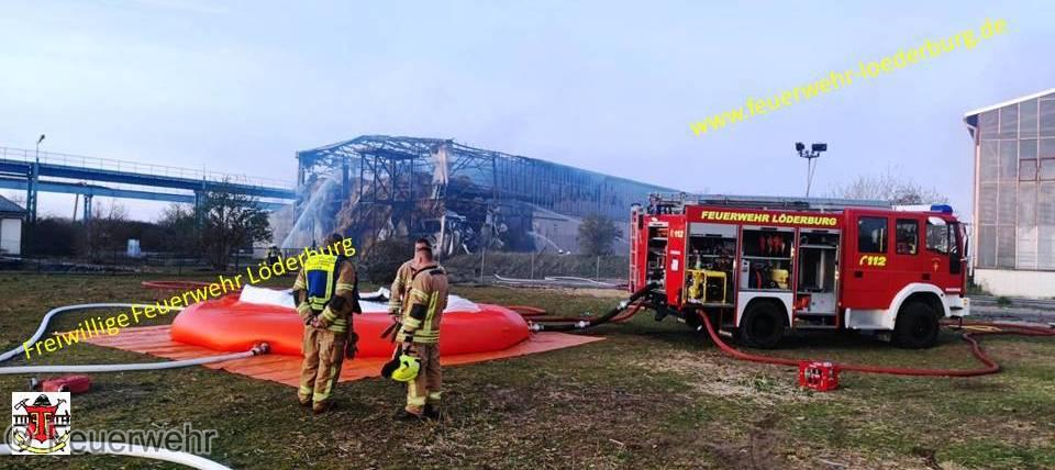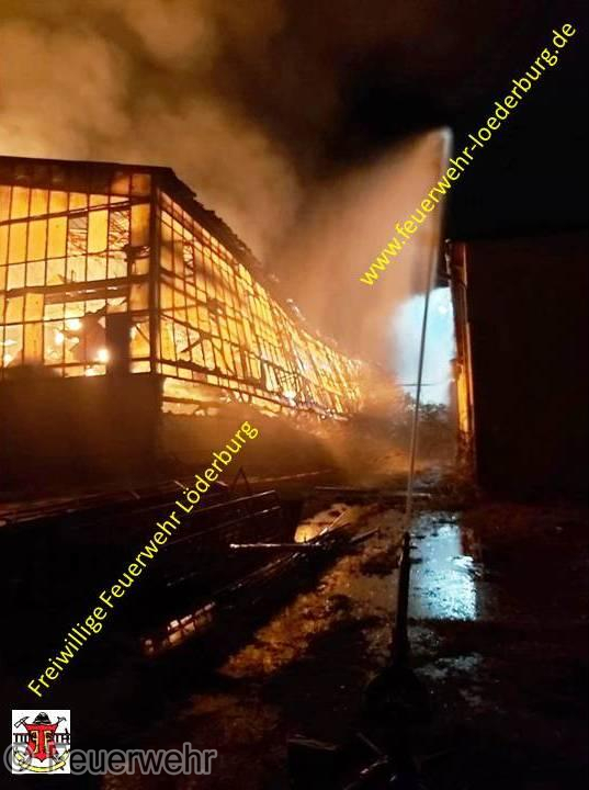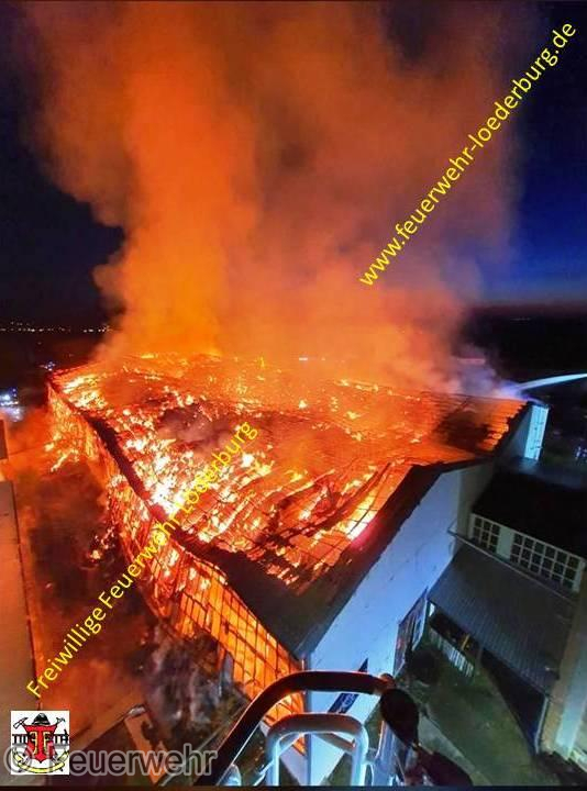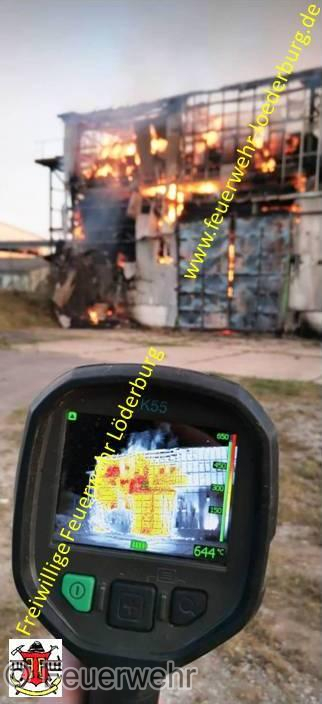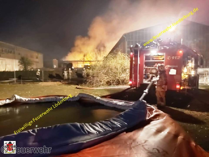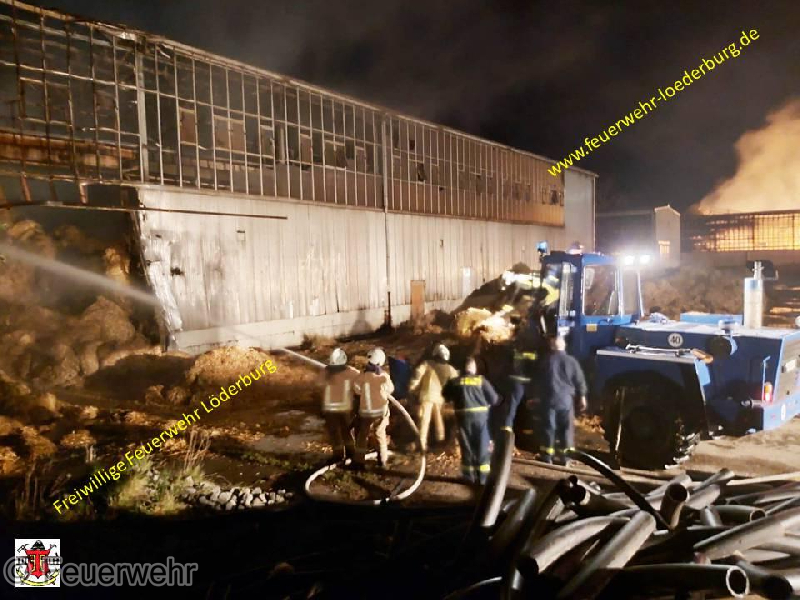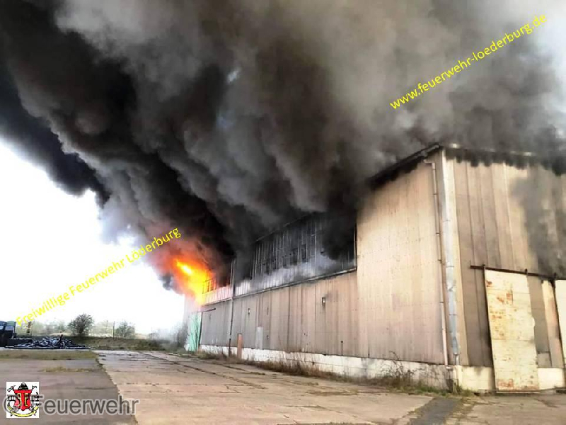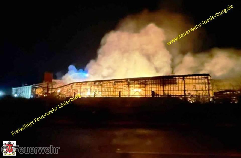 Die Lage bestätigte sich. Es handelte sich um einen Brand einer Lagerhalle, welche bereits in voller Ausdehnung brannte und vollständig mit Stroh gefüllt war.