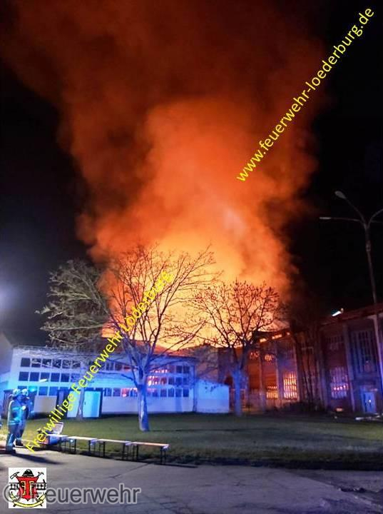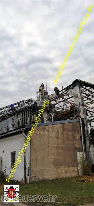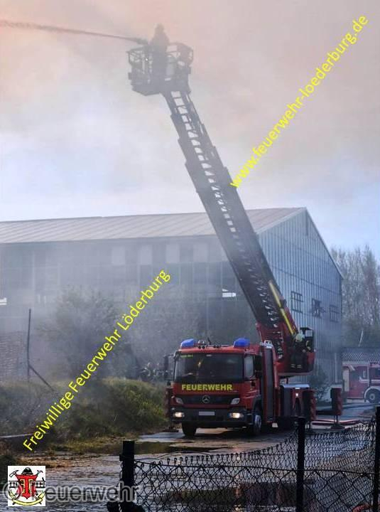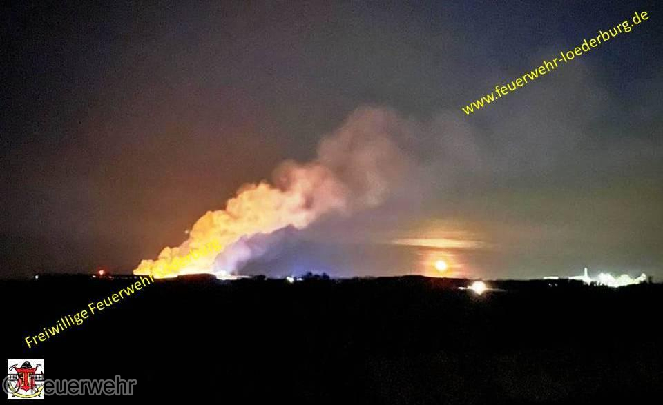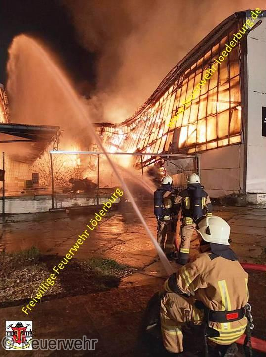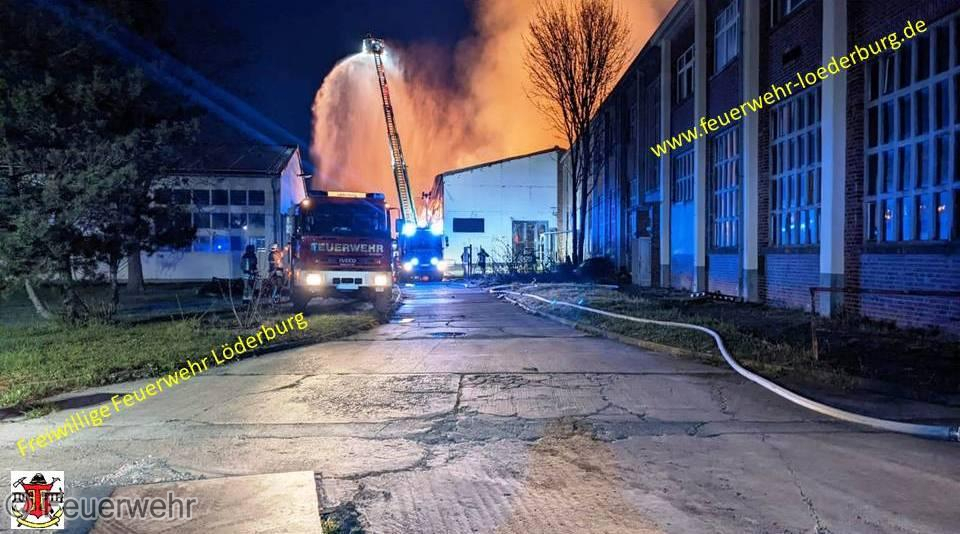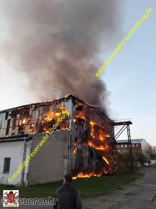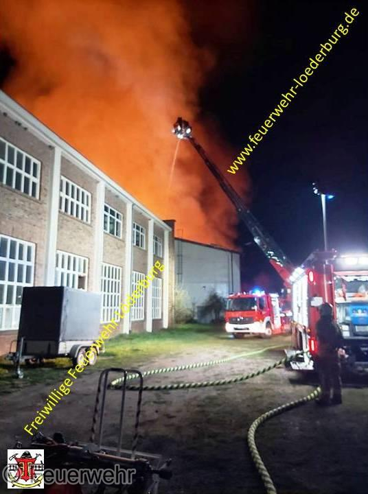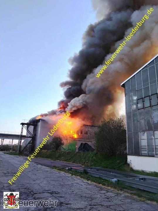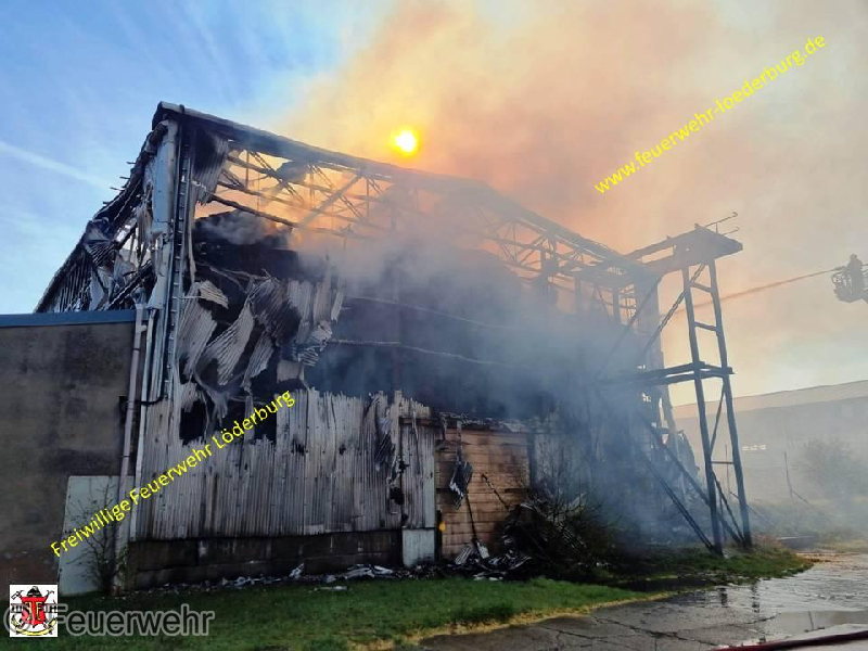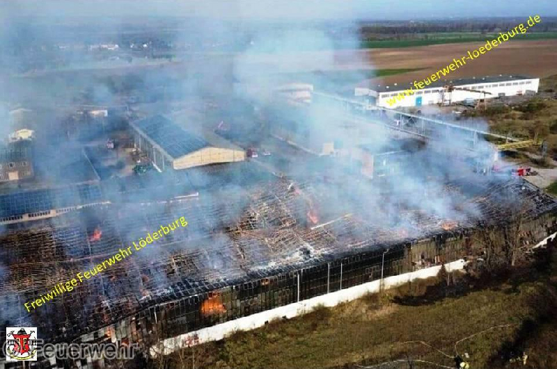 Die Lage bestätigte sich. Es handelte sich um einen Brand einer Lagerhalle, welche bereits in voller Ausdehnung brannte und vollständig mit Stroh gefüllt war.