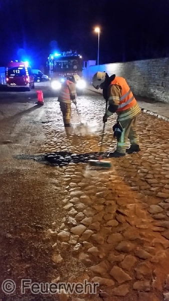 Es handelte sich bei diesem Einsatz um eine ca. 200m lange Ölspur, die durch uns abgestumpft wurde. Danach wurde die Einsatzstelle durch den Einsatzleiter an den Stadtpflegebetrieb übergeben, der Warnschilder aufstellte.