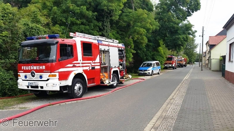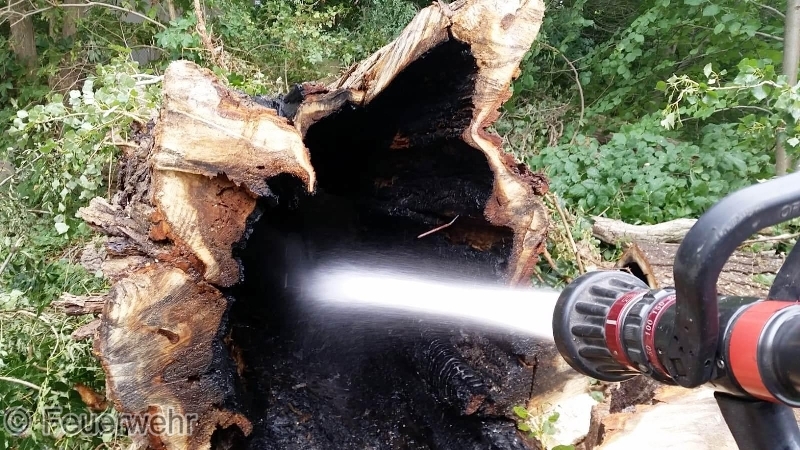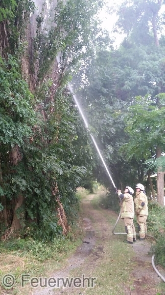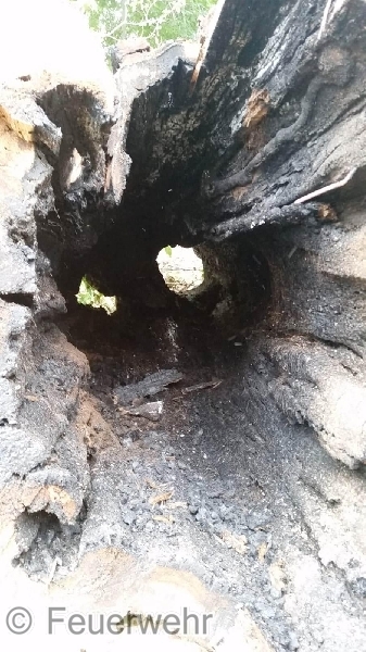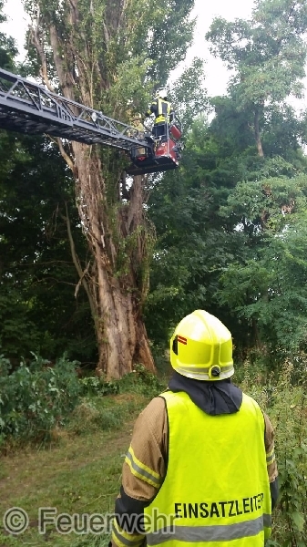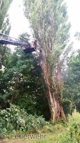 Die Lage bestätigte sich, es handelte sich um einen Brand einer ca. 25m hohen Pappel, die vom Boden an bis zu einer Höhe von 15m ausgehöhlt war. Die Brandbekämpfung mit einem C-Rohr brachte nur einen teilweisen Erfolg, sodass durch den Einsatzleiter die Feuerwehr Egeln mit der Drehleiter zum Einsatzort hinzugezogen wurde.