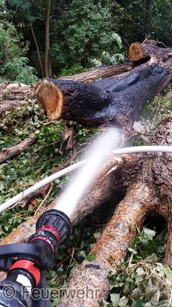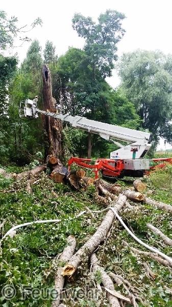 Nach Absprache mit dem vor Ort befindlichen Ordnungsamt der Stadt Staßfurt wurden die Baumpfleger SLK hinzugezogen, die den Baum selbstständig abgetragen haben, sodass durch uns weitere Restlöscharbeiten am Baum vorgenommen werden konnten.