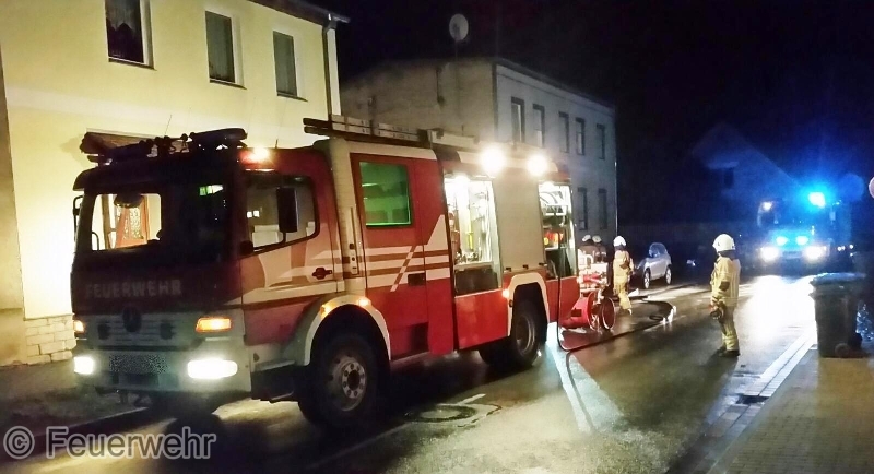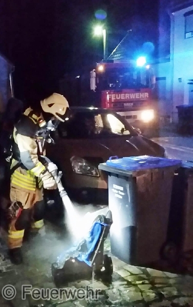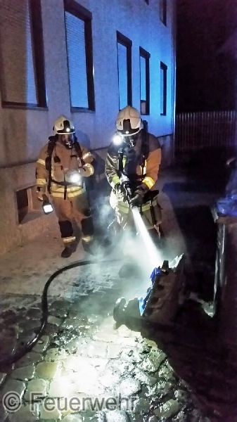Die Lage bestätigte sich nicht, es brannte eine blaue Papiertonne, wo bereits ein Anwohner versuchte ein Ablöschen mittels einem Kleinlöschgerät (Feuerlöscher) vorzunehmen.
