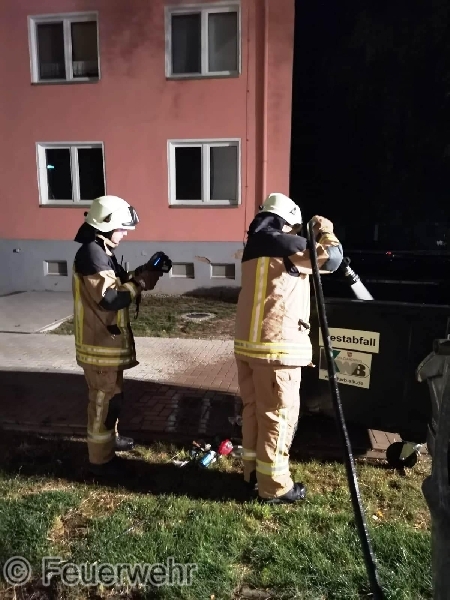 Nach einer kurzen Lageerkundung durch den Einsatzleiter, wurde der Angriffstrupp unter Atemschutz zum Papiercontainer mittels Schnellangriff zur Brandbekämpfung vorgeschickt.