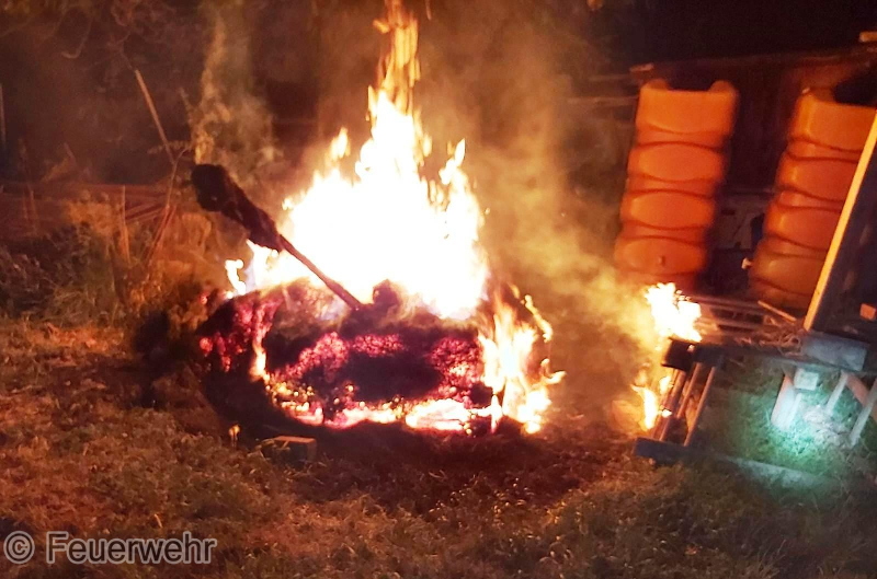 Der „Mittelbrand“ bestätigte sich nicht und konnte demzufolge vom Einsatzleiter auf einen „Kleinbrand“ herabgestuft werden. Es handelte sich um einen Brand eines Heureiters von ca. 3x3m.